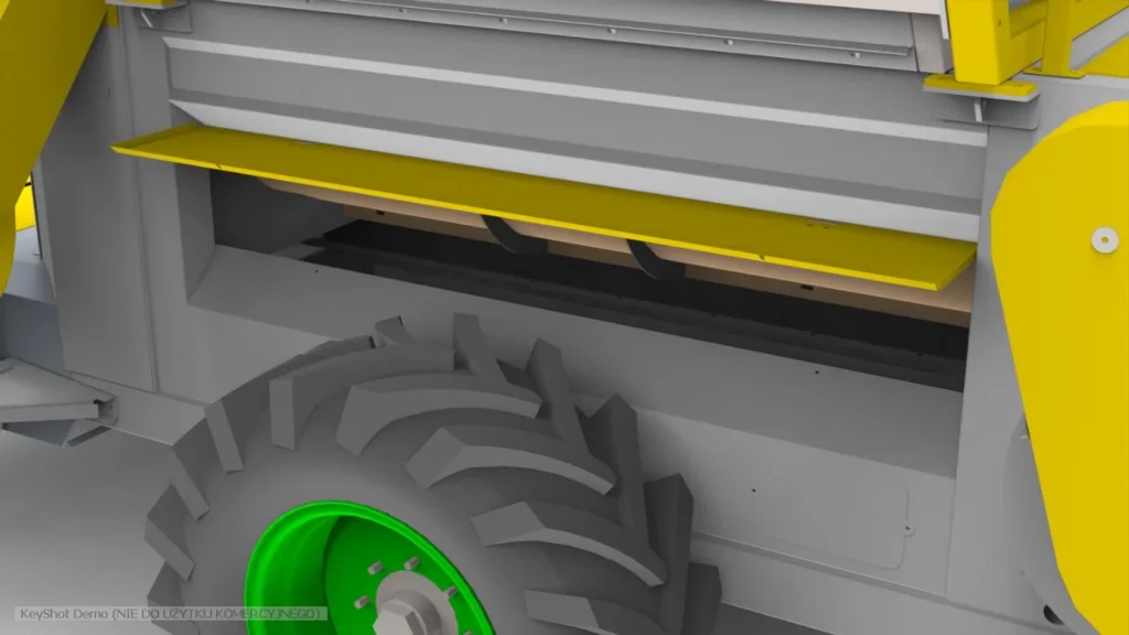 W maszynie zastosowano podzespoły uznanych producentów, takich jak FAG czy SANOK, co gwarantuje trwałość układu jezdnego i duże przebiegi bez potrzeby interwencji serwisowych. Kombajn wyposażony jest w ogumienie 460/70R24 W15Lx24, które zapewnia odpowiednią przyczepność i stabilność, nawet na trudnych terenach.